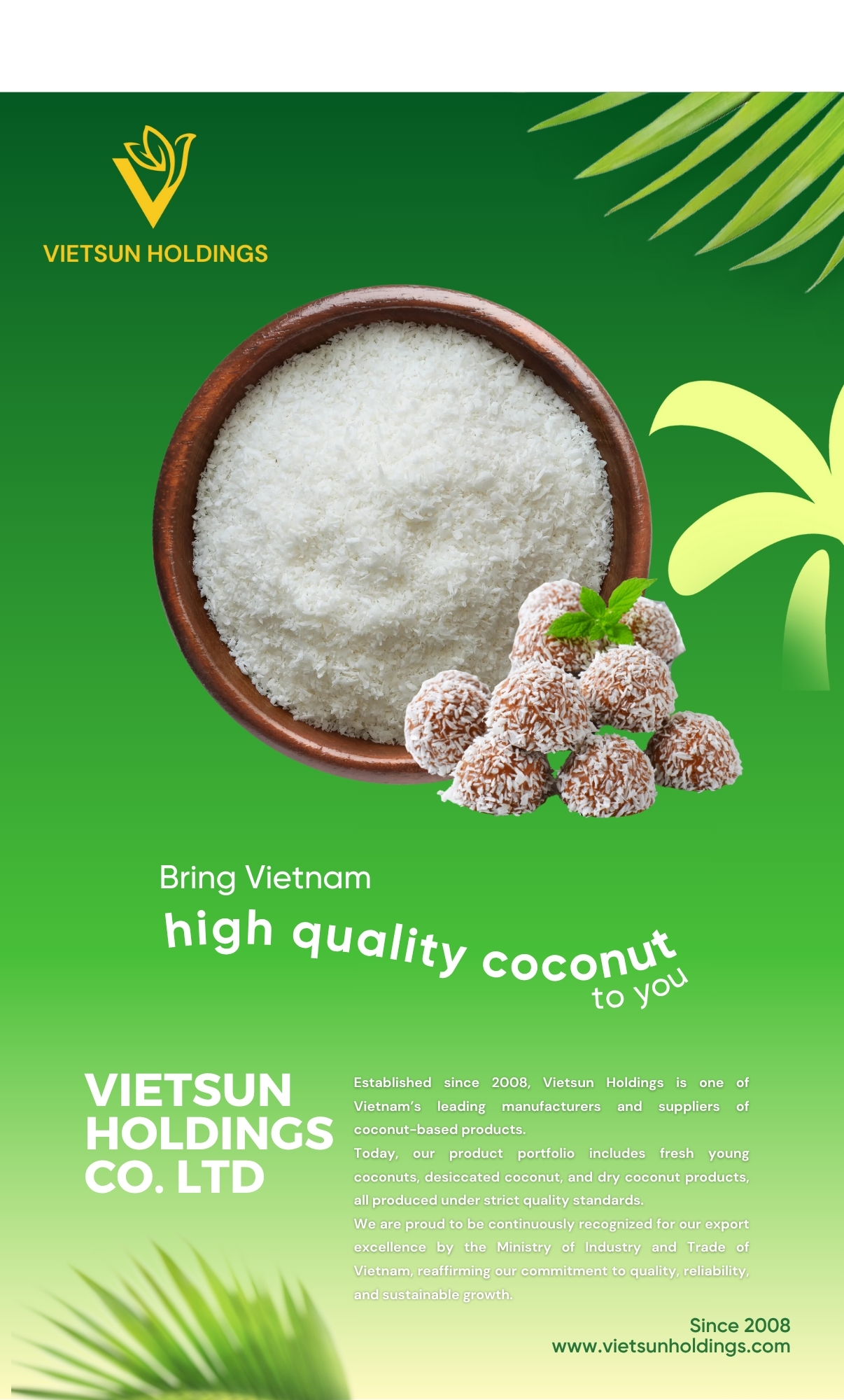 High Fat - Medium Grade Desiccated Coconut of Vietsun Holdings Co., Ltd. is made from carefully selected premium coconuts. The production stages are strictly controlled under ISO 22000:2005 and HACCP (Hazard Analysis and Critical Control Points) standards to ensure clean, safely packaged coconut products. This product delivers high nutritional value, offering both convenience and safety to support the health of consumers.