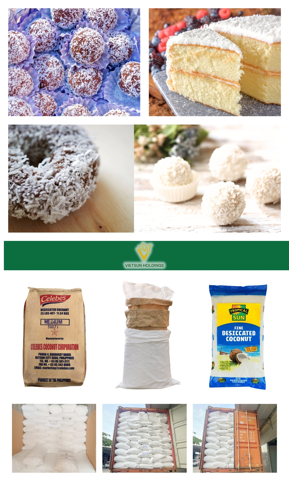 High Fat - Medium Grade Desiccated Coconut of Vietsun Holdings Co., Ltd. is made from carefully selected premium coconuts. The production stages are strictly controlled under ISO 22000:2005 and HACCP (Hazard Analysis and Critical Control Points) standards to ensure clean, safely packaged coconut products. This product delivers high nutritional value, offering both convenience and safety to support the health of consumers.